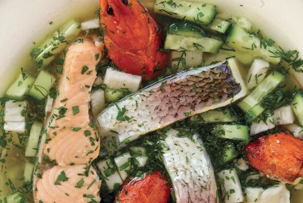 ШАГ 5 В порционную тарелку положить куски рыбы, вареные раковые шейки (на фото раковые скорлупки, чиненные судачьей кнелью), нарезанные овощи и зелень. Залить смесью ухи, кваса и рассола. Щучина готова, подавать ее холодной.