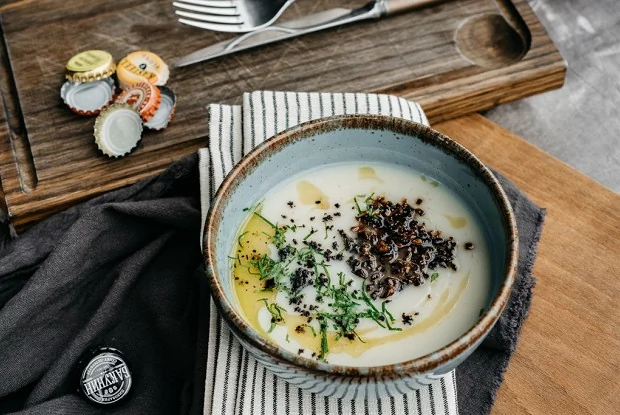 Суп из сельдерея с жареными шампиньонами и трюфельным маслом