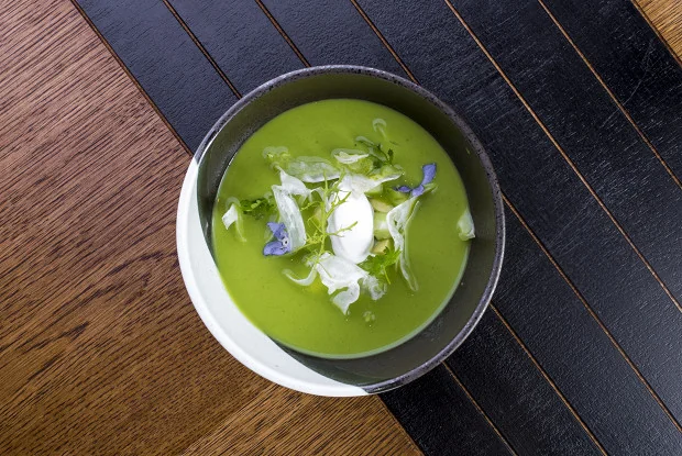 ШАГ 6 Нарезать оставшийся фенхель, авокадо, огурцы. Разлить суп по тарелками, положить овощи, украсить зеленью, сверху выложить шарик сорбета из феты.