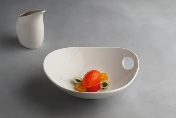 ШАГ 6 Выложить в тарелку разноцветные помидоры, маринованный лук (в него добавить гель из петрушки), на томаты выложить кнель сорбета из печеного перца, полить аджичным маслом. Холодный суп подать отдельно.