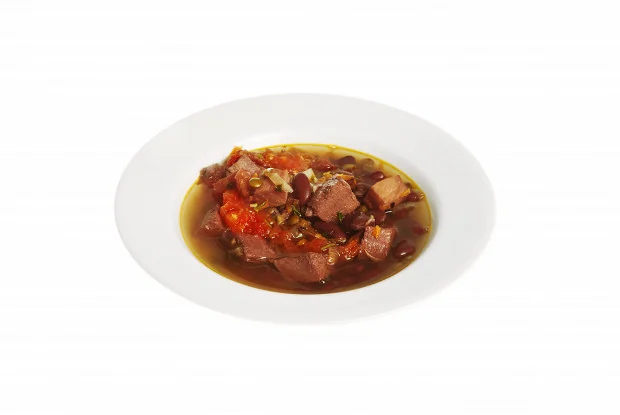 ШАГ 1 Фасоль замочить на ночь в холодной воде, затем слить воду и отварить фасоль в четырех литрах воды в течение часа. Отдельно сварить чечевицу в течение 20 минут. Копчености нарезать крупным кубиком и бросить к фасоли, варить 15–20 минут.
