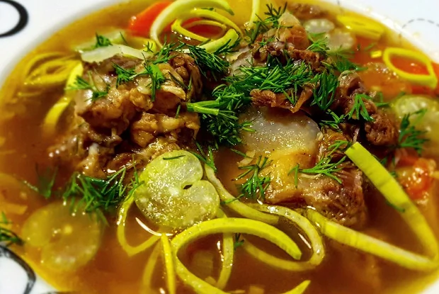ШАГ 1 Бычий хвост порубить на части, помыть и положить в глубокую кастрюлю. Залить холодной водой и поставить на огонь. При закипании убрать пенку. К хвосту добавить репчатый лук (целую луковицу), лавровые листья, нарезанную крупно морковь, стебель сельдерея, 2–3 пера порея, 3 головки гвоздики, душистый перец горошком. Варить на медленном огне 4 часа. Не забывать подливать выкипающую воду.