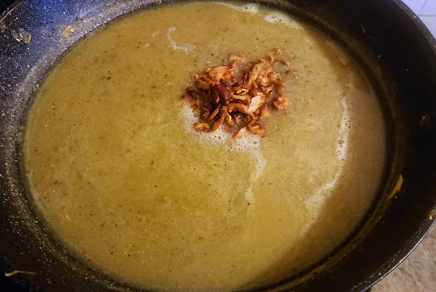 ШАГ 2 Влить бульон, довести до кипения и варить 10 минут. Охладить, протереть через сито вместе с бульоном.