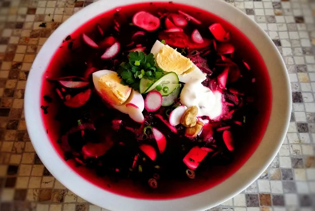 ШАГ 8 В тарелку выложить заправку, залить свекольным отваром и квасом в пропорции, как больше нравится. Также по вкусу добавить сметану, горчицу и хрен. Попробовать, посолить и поперчить по вкусу, если надо.