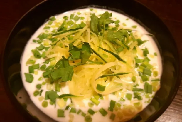 ШАГ 3 В глубокую тарелку положить горкой спагетти из огурца и кабачка, залить кефиром с зеленью и специями.