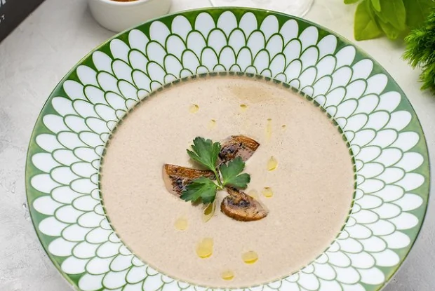 ШАГ 4 При подаче в тарелке теплый суп приправить обжаренными шампиньонами и петрушкой, полить оливковым маслом. Сухарики из белого хлеба подавать отдельно.