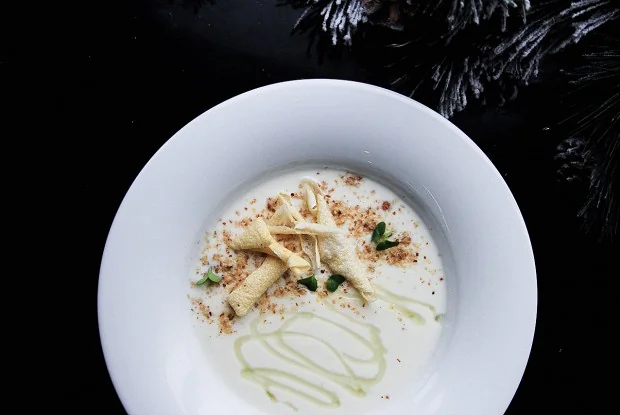 Крем-суп из цветной капусты с горгонзолой, копченым миндалем и медом алоэ