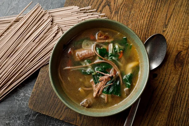 ШАГ 6 Добавить гречневую лапшу и варить еще 3 минуты до готовности лапши, довести до вкуса соевым соусом и солью.