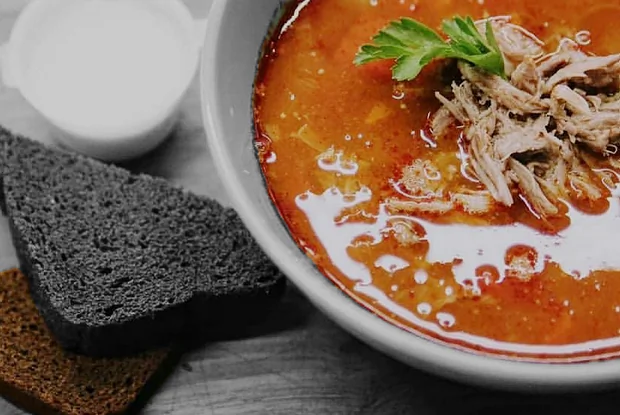 ШАГ 10 Тем временем разобрать мясо из бульона, отделив мякоть от костей. Кости выбросить, мясо мелко нарезать или разобрать на волокна и добавить в борщ. Попробовать суп — и добавить соли и перца, если требуется. Дать борщу настояться час.
