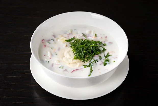 ШАГ 3 Добавить в каждую тарелку заправку из хрена и горчицы, налить квас или кефир, перемешать. Посыпать рубленой зеленью и подавать.