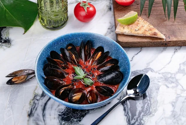 ШАГ 5 Разлить суп по тарелкам, сверху выложить мидии, украсить кресс-салатом.