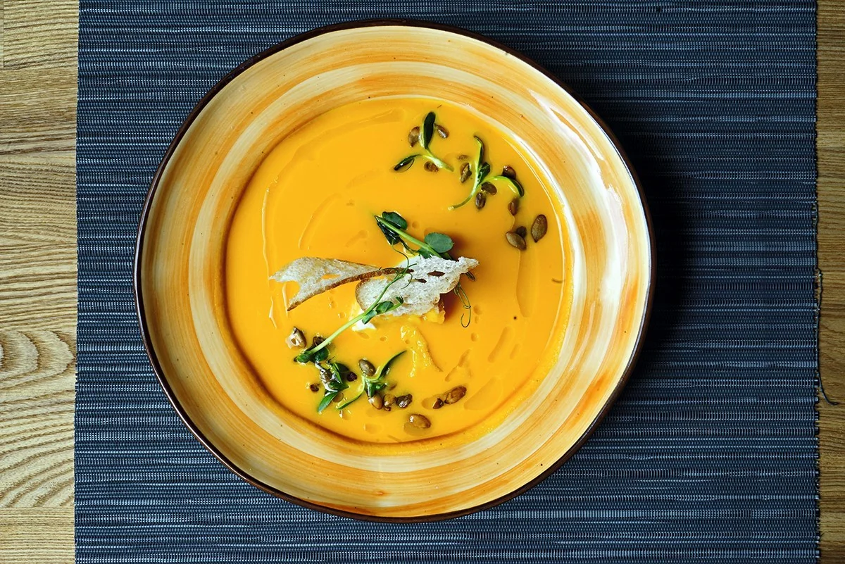 ШАГ 3 Соединить тыкву с имбирем, пассеровку, сливки и пробить блендером, постепенно добавляя бульон от тыквы до нужной густоты. Суп прогреть в сотейнике и довести до вкуса (соль, перец, сахар, соевый соус).