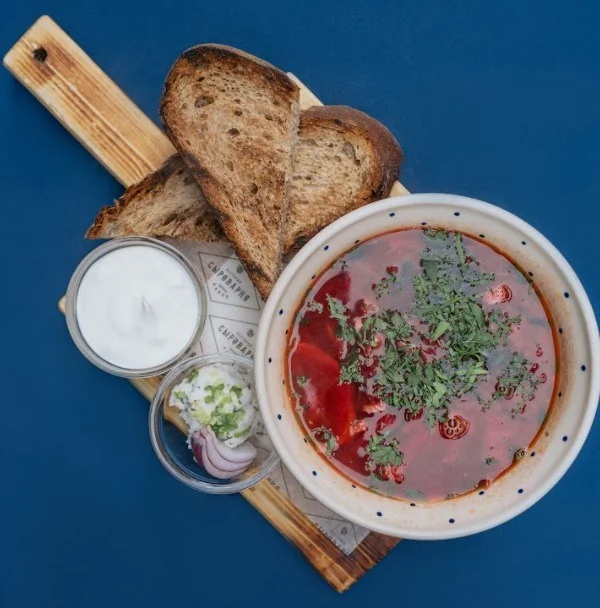 ШАГ 6 В соусники положить сметану, сало, красный и зеленый лук.