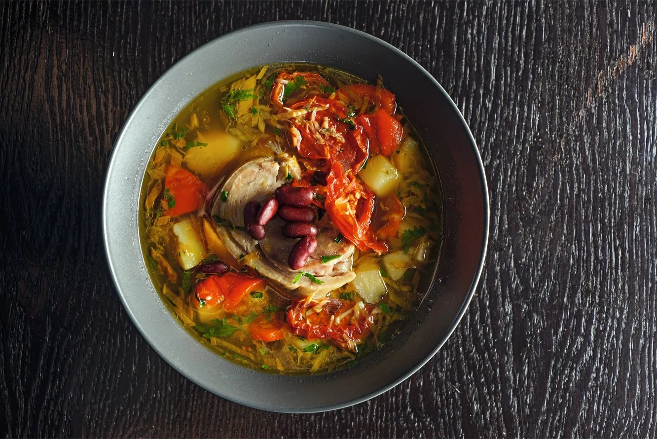 ШАГ 5 Для подачи суп налить в тарелку, положить кусочки рульки, вяленые помидоры и красную фасоль. Посыпать рубленой петрушкой.
