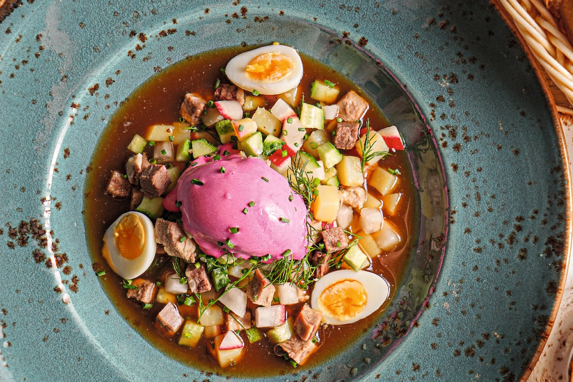 Окрошка со свекольным мороженым и хреном