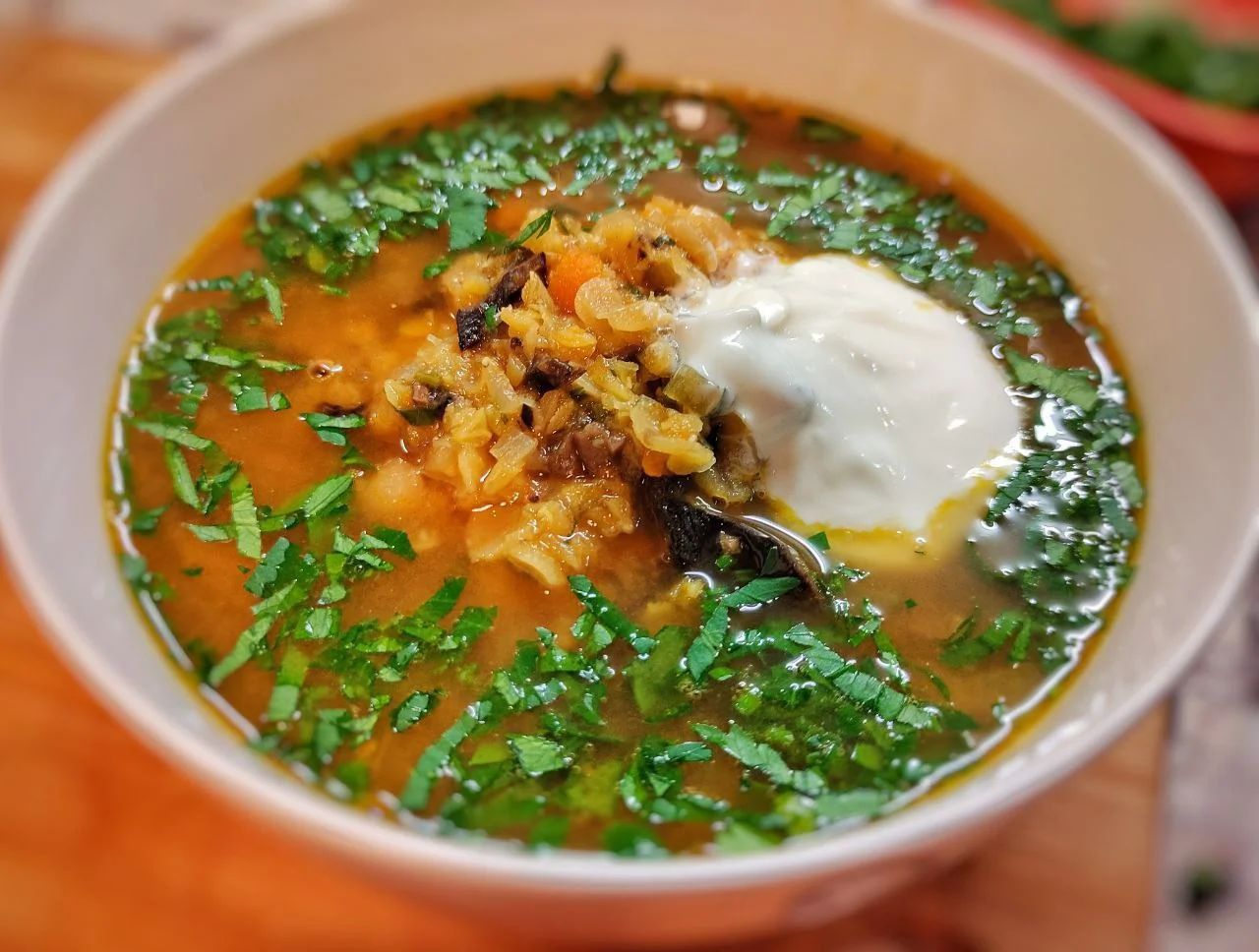 ШАГ 7 Через 10 минут выключить огонь, оставить суп отдохнуть на 15 минут. Разлить по тарелкам, добавить по вкусу зелень и сметану.