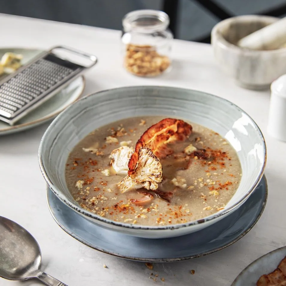 Суп-пюре из цветной капусты и шампиньонов с сыром дорблю и беконом