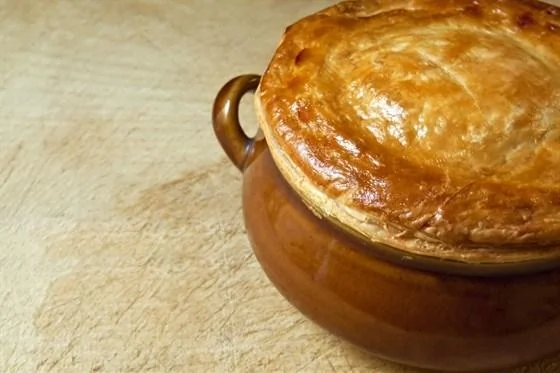 ШАГ 7 Слоеное тесто раскатать по рабочей поверхности и вырезать из него круги диаметром 13-14 см. Каждую чашку накрыть кругами теста и натянуть его края на внешние стенки чашки.