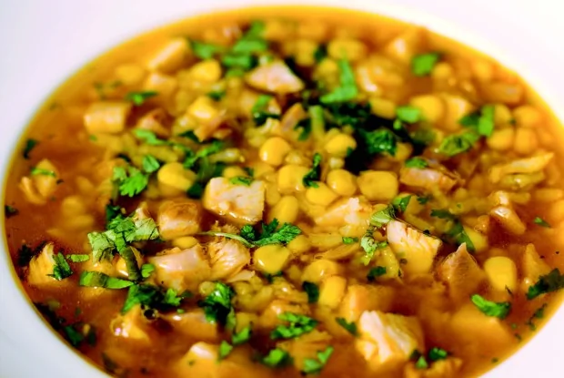 ШАГ 7 Добавить кусочки курицы и кукурузу и варить при пузырьковом кипении 5 минут, пока кукуруза не размягчится, а курица не прогреется.