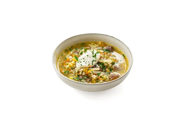 ШАГ 9 Процедить бульон. Добавить в него зажарку, перловку, картофель и сердечки. Варить до готовности картофеля, около 10 минут.