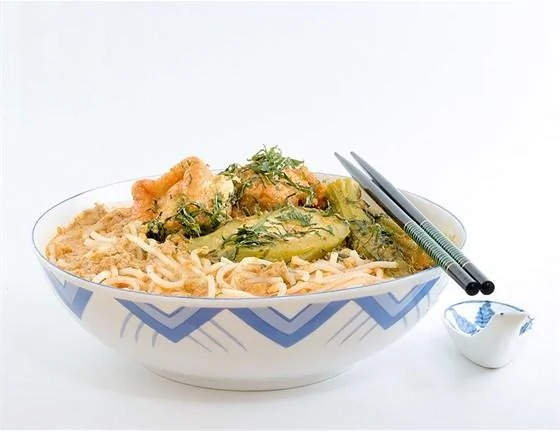 ШАГ 3 Доведите бульон до кипения и вылейте к вермишели. Сверху положите капусту и тофу. Посыпьте кориандром.