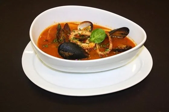 ШАГ 2 Налить рыбный бульон. Довести до кипения и поставить на медленный огонь на 5 -6 минут. Посолить, поперчить. Суп можно подать с белыми чесночными тостами.