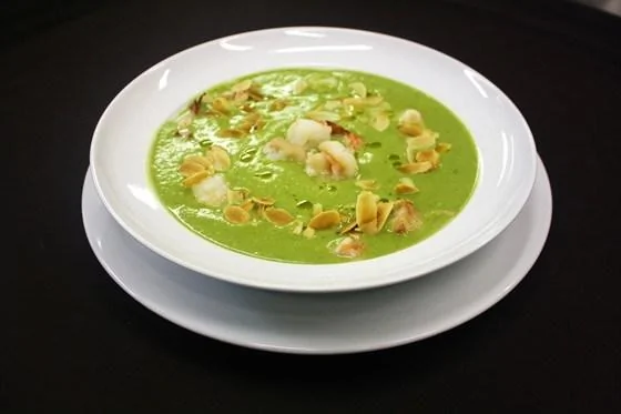 ШАГ 2 Суп налить в тарелку и сверху выложить припущенные креветки и обжаренный миндаль.