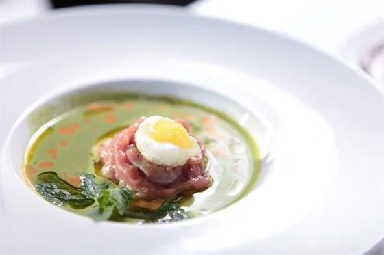 ШАГ 3 Оформить блюдо. Вырезку выложить на дно тарелки, затем налить суп. Украсить жареным яйцом и мятой, полить оливковым маслом.