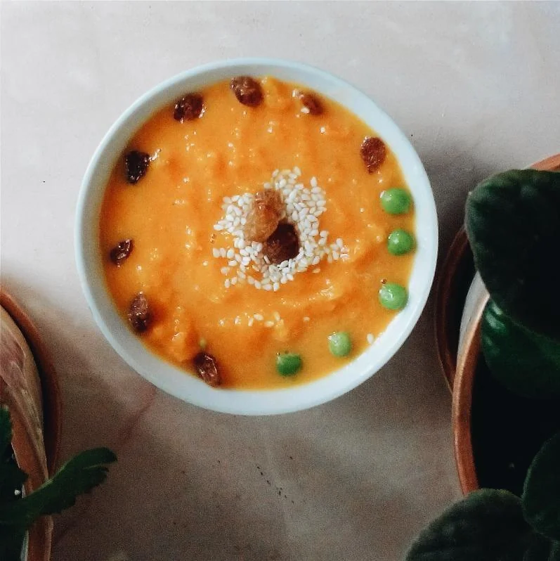 ШАГ 4 К тыкве с морковью добавляем обжаренные овощи и натертый корень имбиря, измельчаем блендером.