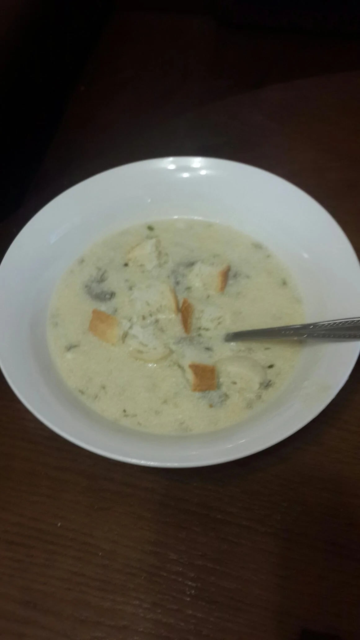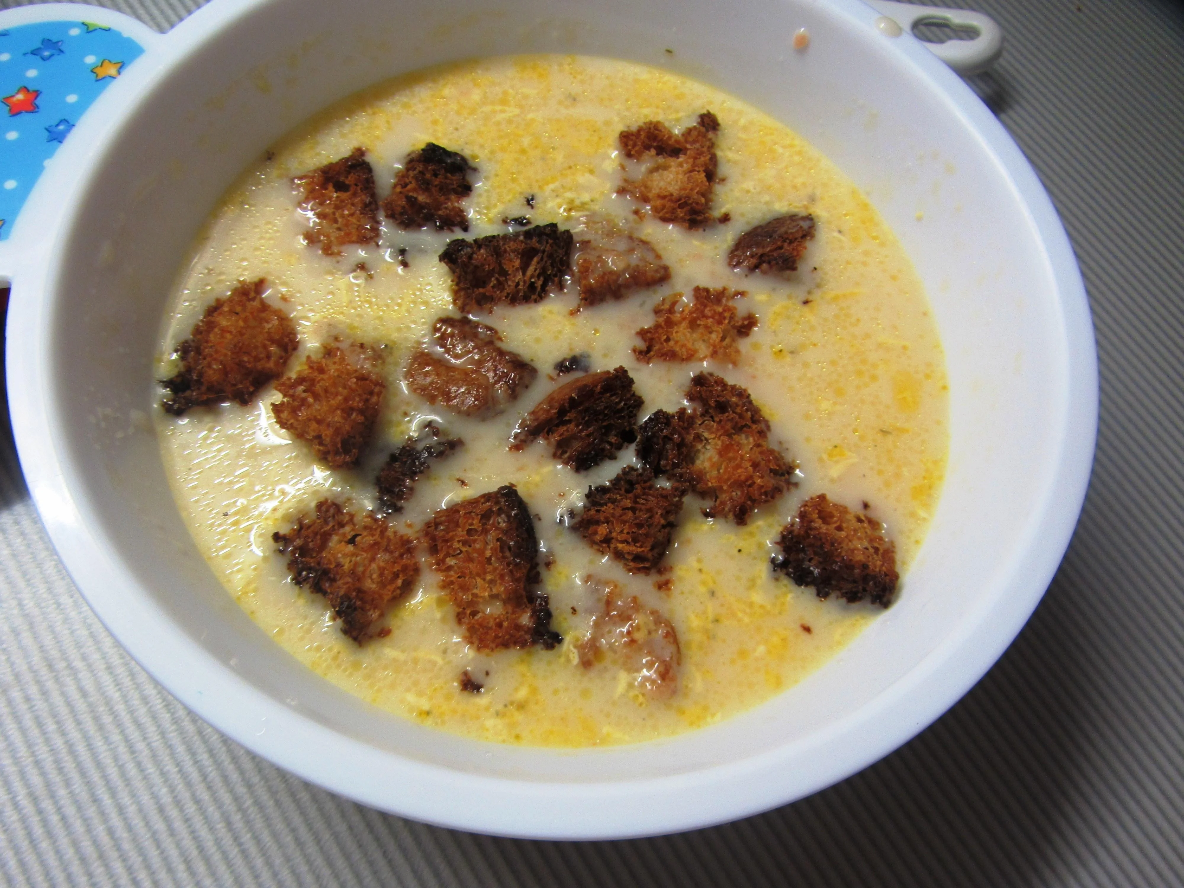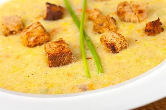 ШАГ 4 Подавайте с гренками. Для их приготовления нарежьте белый хлеб кусками и обжарьте на сливочном масле.