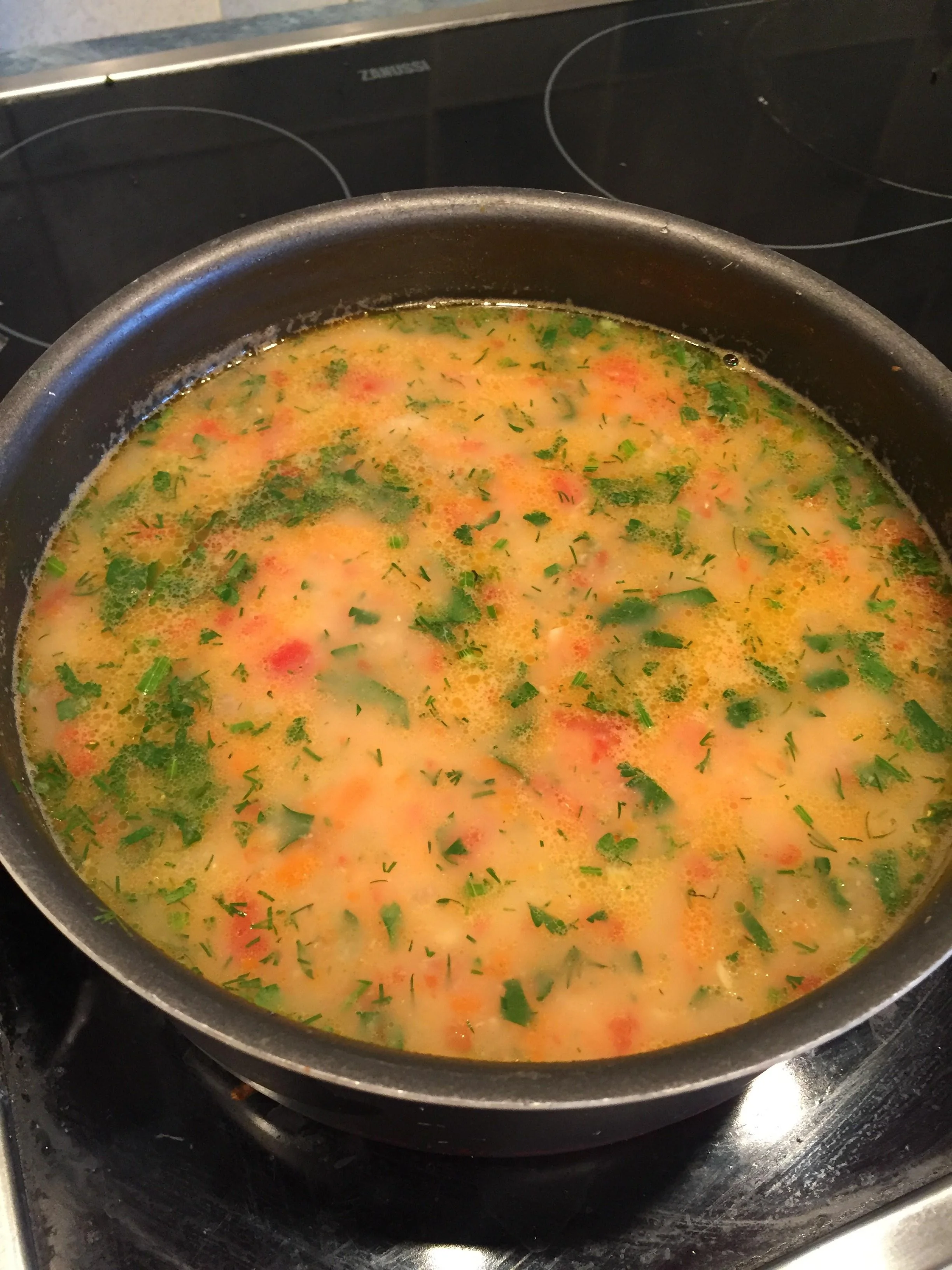ШАГ 7 Влить в рыбный суп сливки и снять с огня. Посыпать рубленой зеленью.