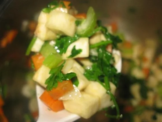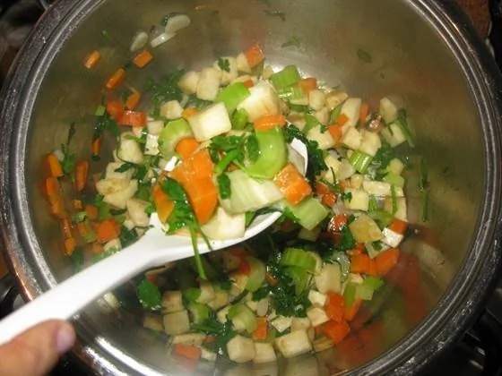 ШАГ 9 Туда же сразу можно кинуть пучок нарезанной со стебельками петрушки, немного потомить, когда чеснок начнет румяниться, можно добавлять сельдерей и морковь.