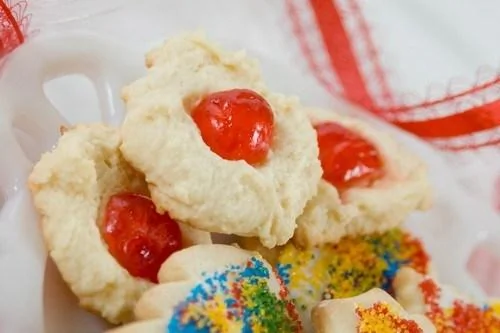 ШАГ 2 Тесто раскатать в пласт толщиной 1 см и формочками вырезать печенье. На каждое печенье положить вишенку без косточки и посыпать ванильным сахаром.