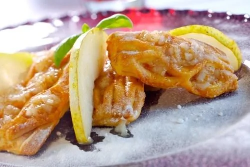 ШАГ 3 Противень смазать сливочным маслом, посыпать мукой и уложить в него жгутики, каждый слегка разрезав вдоль ножом. В разрез вложить длинный ломтик айвы и выпекать при 150 градусов.