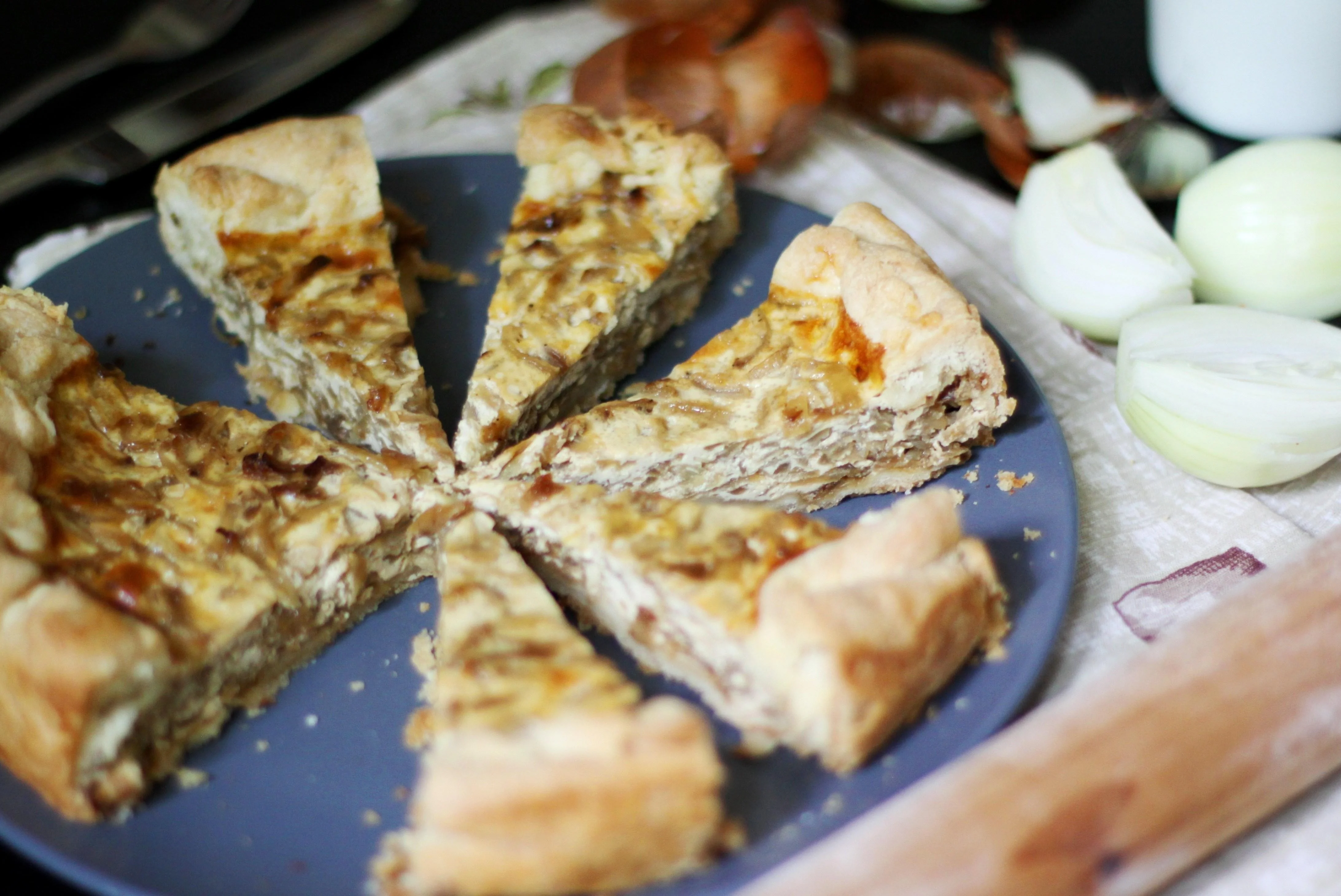 ШАГ 2 Для приготовления начинки нарежьте лук тонкими кольцами и обжаривайте 2 – 3 минуты на сливочном масле. Добавьте воду и тушите на среднем огне, пока лук не станет прозрачным, а жидкость не испарится. Слегка присыпьте лук сахаром.