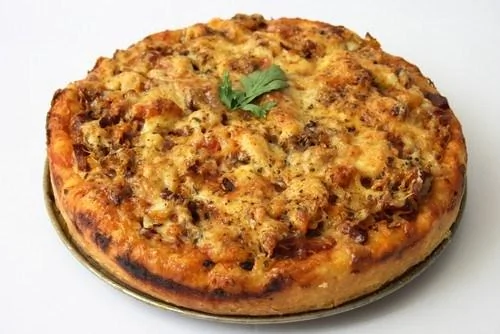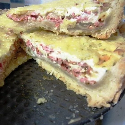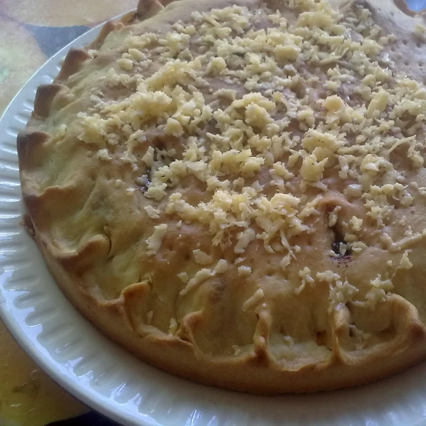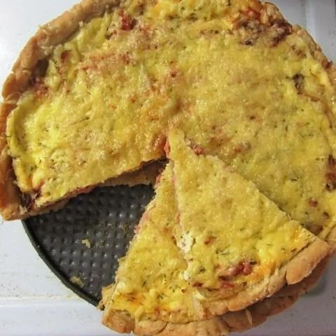 ШАГ 3 Выложите начинку на тесто, залейте взбитыми яйцами, смешанными со сливками, солью, перцем. Сверху посыпьте тертым сыром.