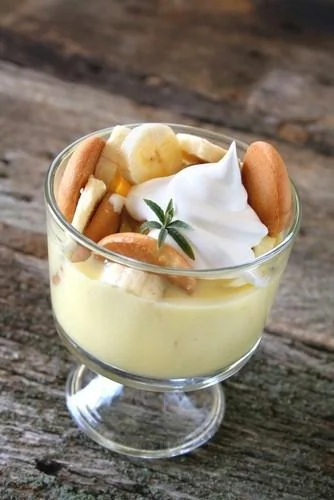 ШАГ 2 В высокие бокалы положите по 1 столовой ложке взбитых сливок, затем разложите четверть кусочков банана, затем по 1 столовой ложке ванильного пудинга, снова четверть кусочков бананов и по 1 круглой ванильной вафле. Повторите слои, чтобы сверху получились взбитые сливки.