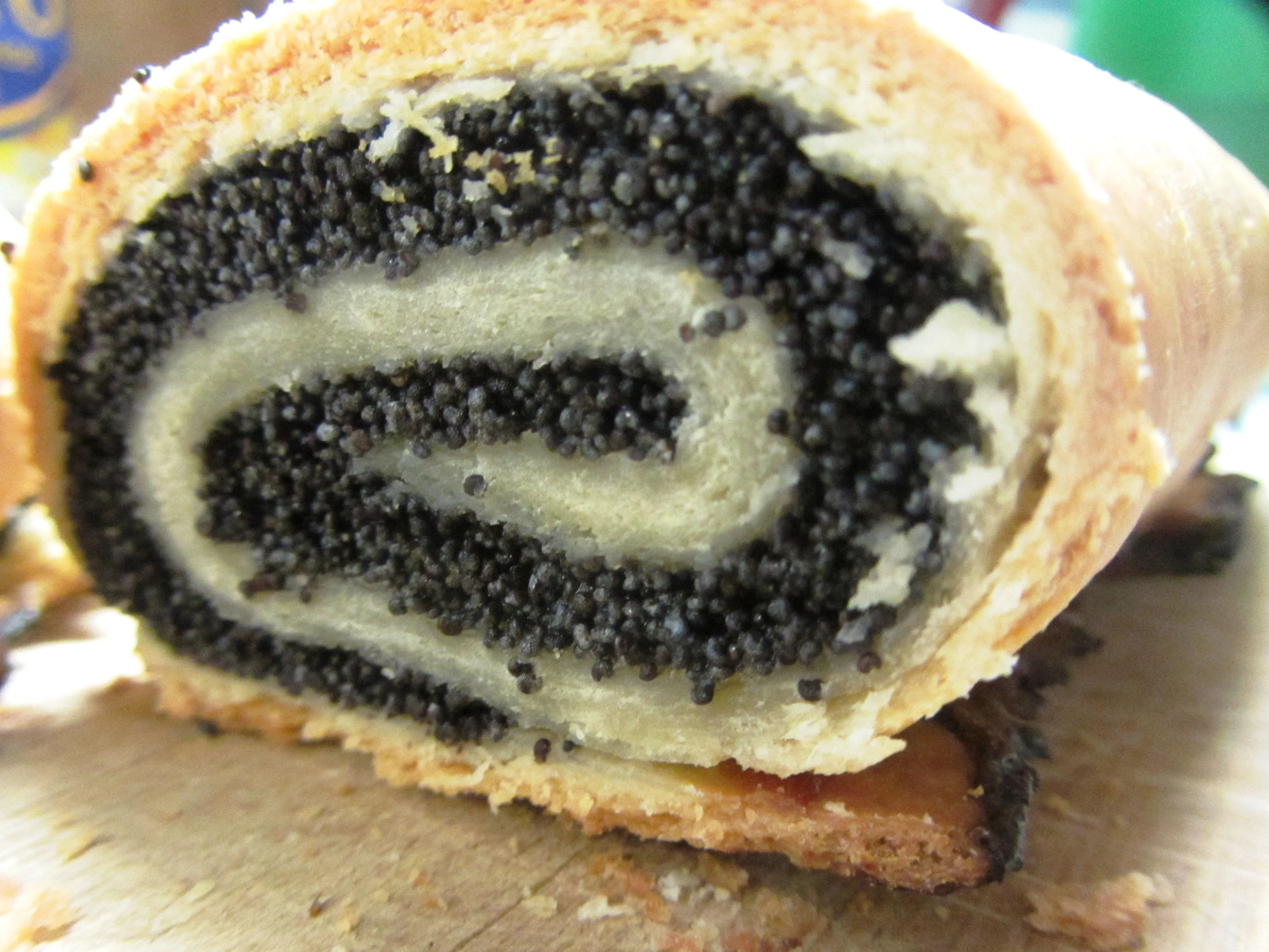 ШАГ 4 Тесто раскатать на посыпанном мукой полотенце в пласт. Затем растянуть его руками до размера около 50x70 см. Смазать растопленным маслом. Затем выложить маковую начинку, оставив продольные края на 3 см. Посыпать изюмом.