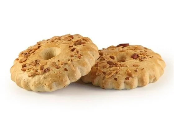 ШАГ 3 Полученные кольца положить на лист, смазать взбитым яичным белком, посыпать рубленым миндалем или арахисом и поставить в духовой шкаф на 10–15 минут для выпечки.
