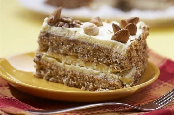 ШАГ 4 Одну лепешку поместить на блюдо, положить на нее слой сливочной массы, разровнять и накрыть второй лепешкой, смазать верх лепешки сливочной массой, обсыпать рубленым, зарумяненным в духовом шкафу миндалем и подать к столу.