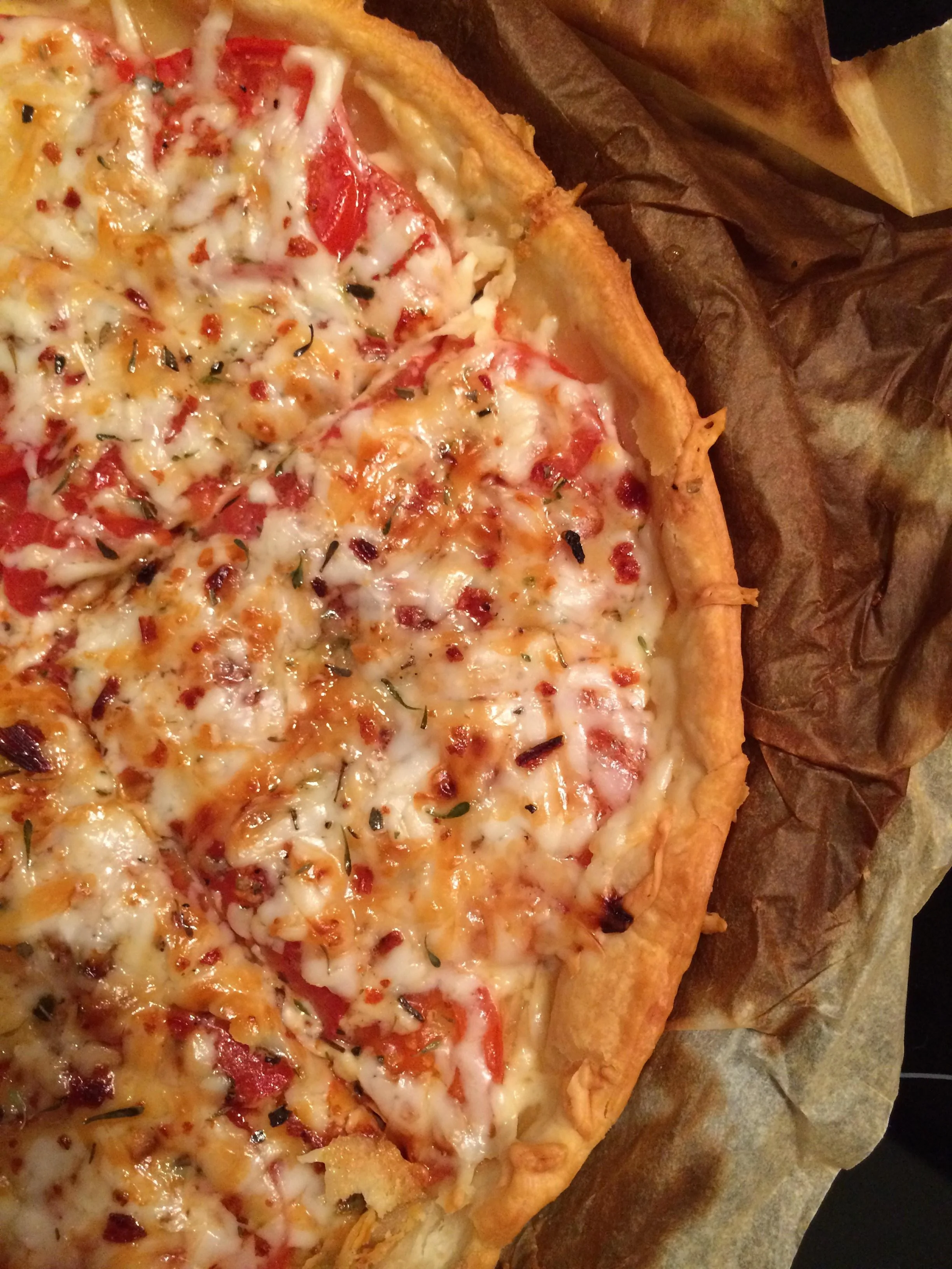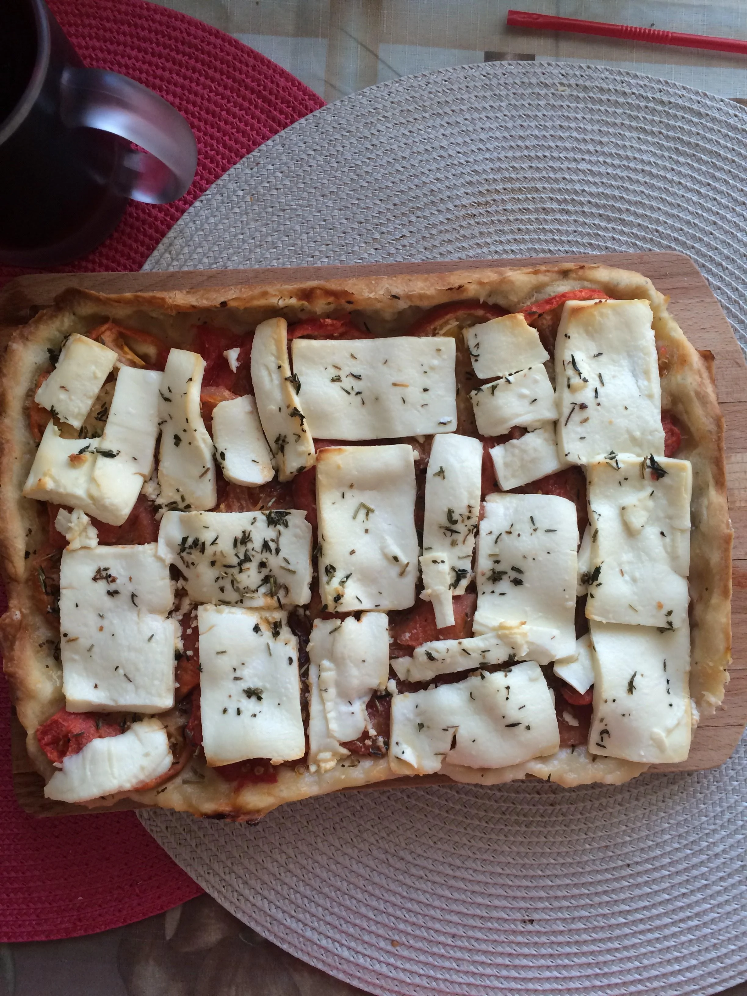 ШАГ 3 На тесто ровным слоем намажьте горчицу и оставьте на несколько минут. Затем выложите ровным слоем тонко нарезанные помидоры, сбрызните оливковым маслом. Посыпьте травами и выложите нарезанный ломтиками сыр. Опять посыпьте травами и сбрызните медом.