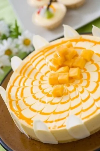 ШАГ 7 Яичные желтки взбить с сахаром. Добавить сливки. Замочить желатин в холодной воде на 5 минут. Разогреть яично-сливочную массу на небольшом огне и варить, помешивая, 2-3 минуты до легкого загустения. Снять с огня и ввести отжатый желатин и пюре манго. Крем полностью охладить, а затем выложить в форму с тестом. Поместить в холодильник на 2-3 часа для застывания крема, а затем украсить ломтиками манго.