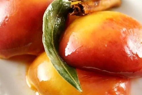 ШАГ 3 Аккуратно снять миску и слить выделившийся персиковый сок в отдельную емкость, персики шумовкой выложить на блюдо.