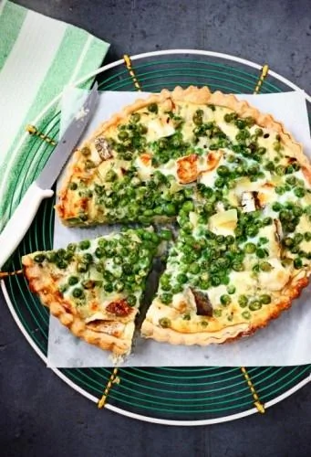 Слоеный пирог с зеленым горошком, беконом, пармезаном и зеленью