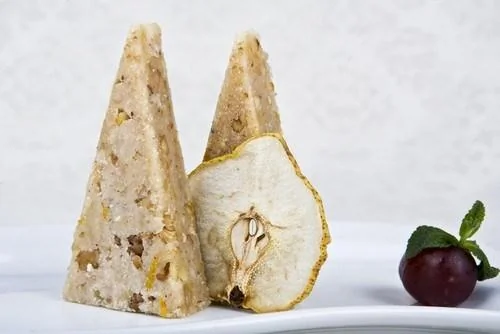 ШАГ 4 Выложить массу на большую тарелку (или плоский поддон) слоем 3-5 см, разровнять и украсить грецким орехом.