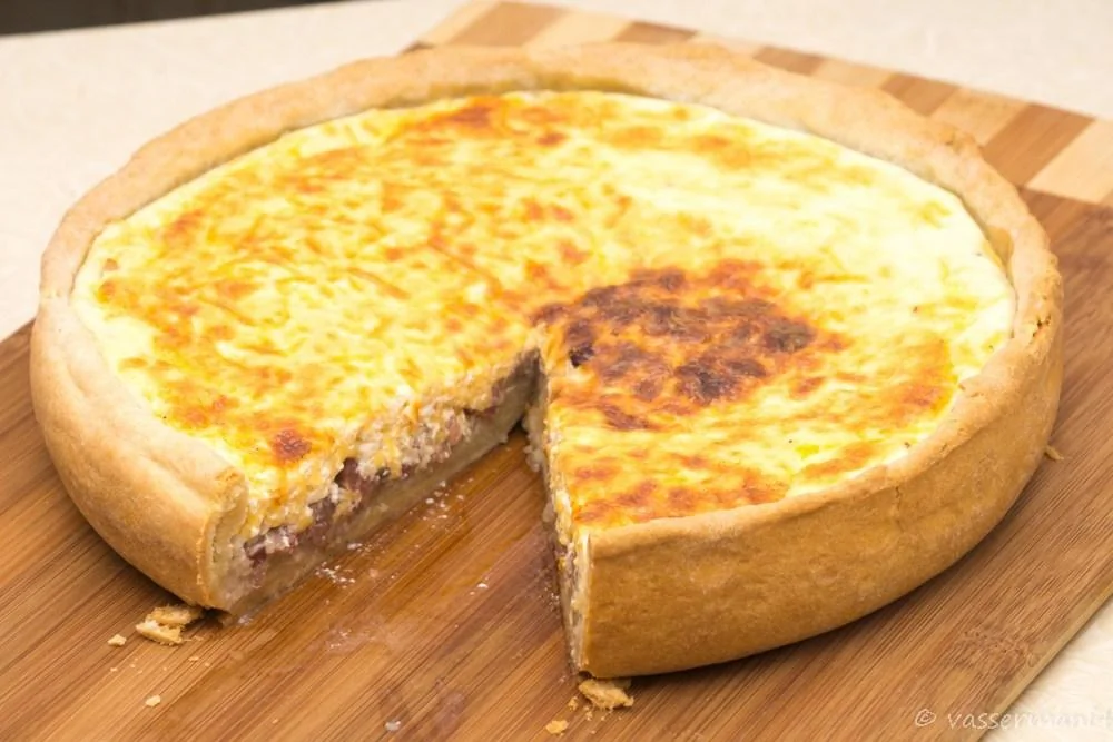 Песочное тесто Сыровяленая свиная грудинка Оливковое масло Сметана 42%-ная Яйцо куриное Лук-порей Сыр Соль Перец черный молотый Выпечка и десерты Французская кухня Киш