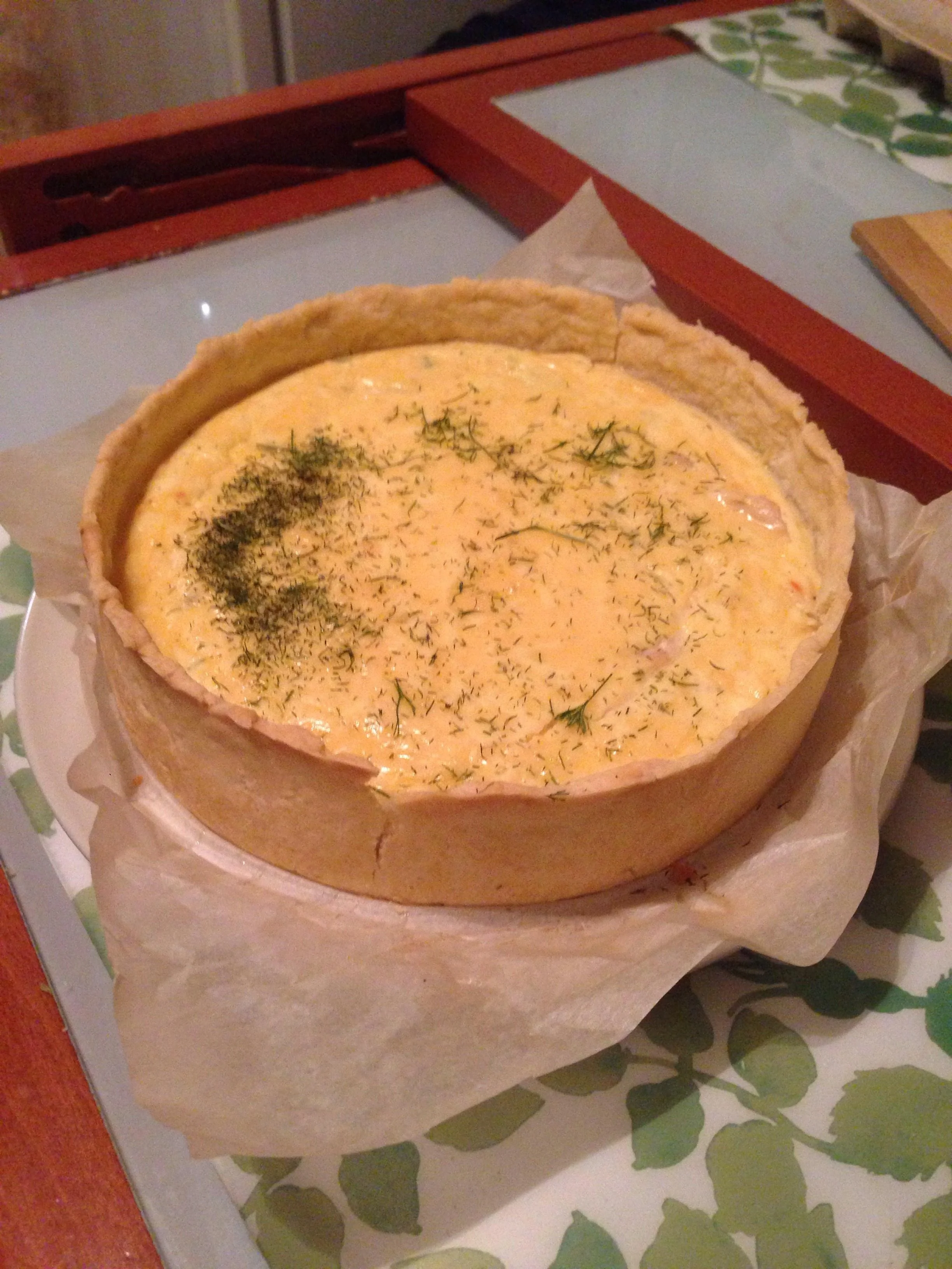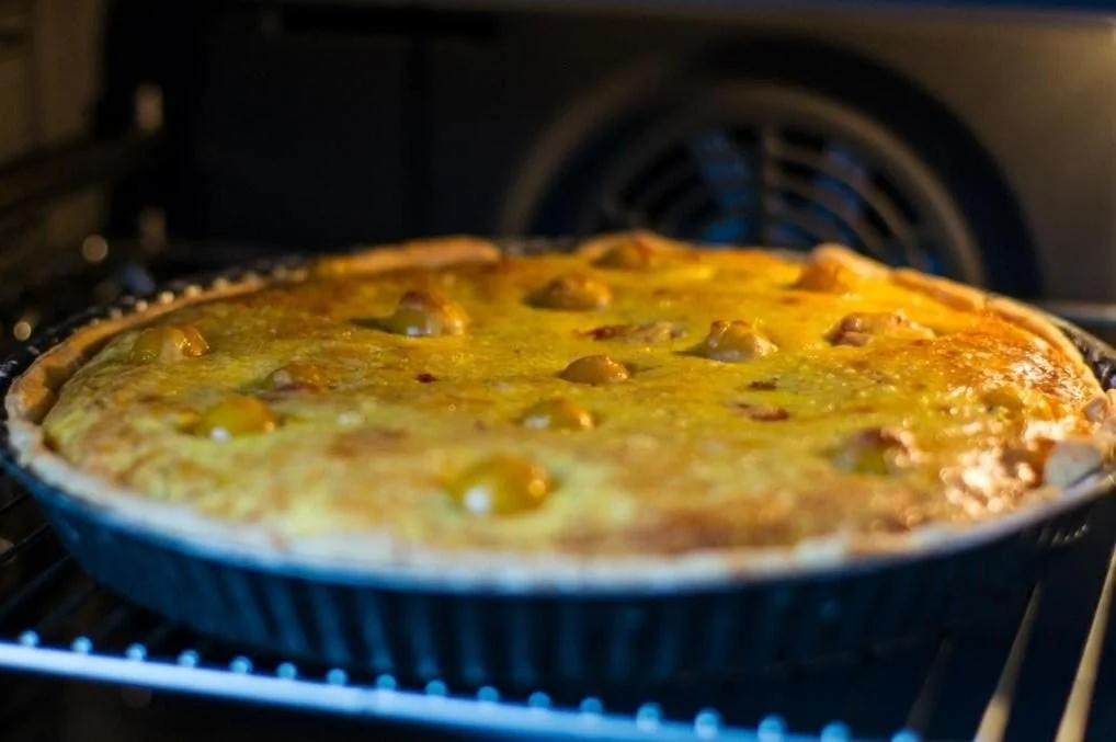 ШАГ 4 Тесто раскатать и выложить в форму (диаметром 24 см), сделать вилкой проколы в тесте и влить начинку.