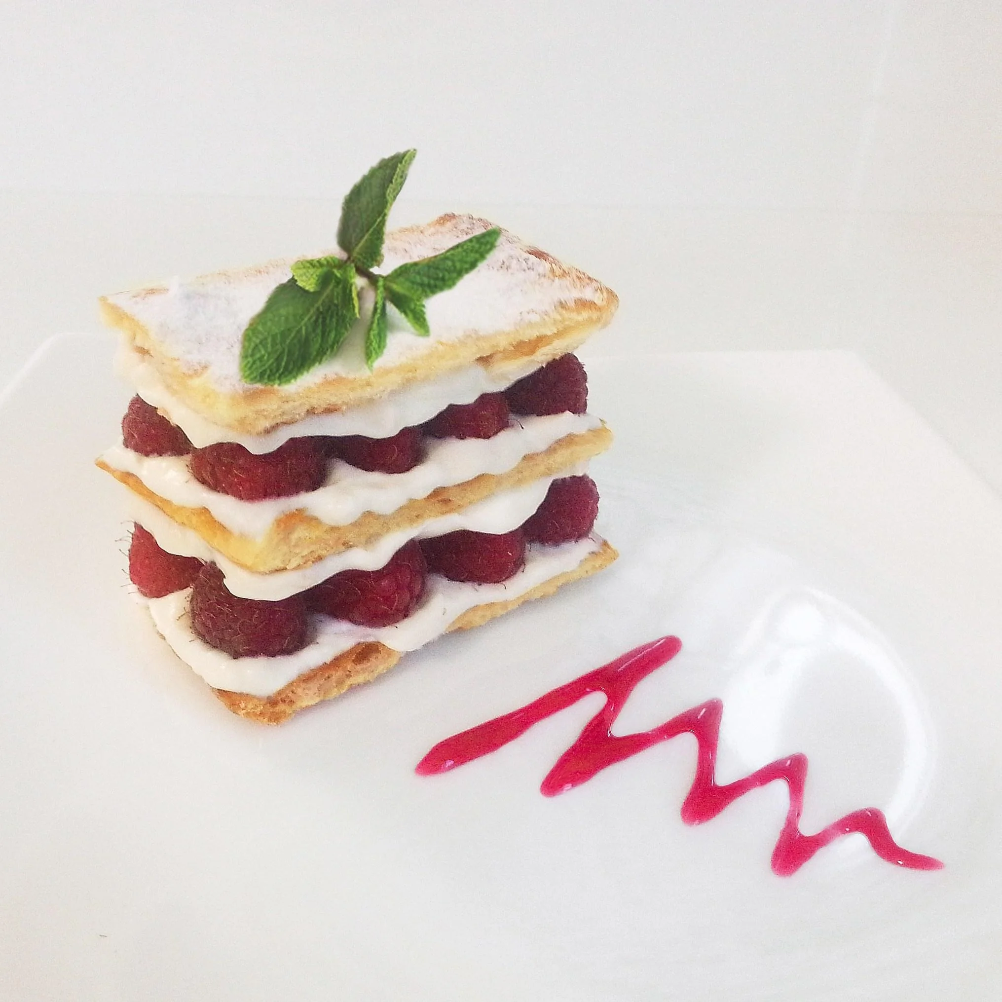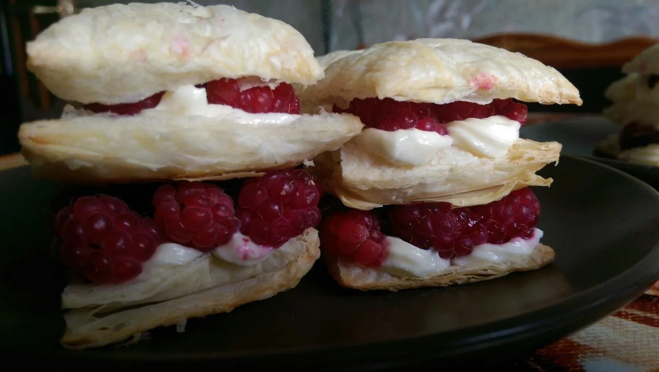 ШАГ 2 Взбить сливки с сахарной пудрой до густой консистенции. Проложить слои теста сливками и малиной.