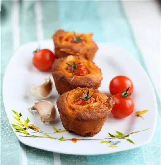 ШАГ 2 Нарезанные мелкими кусочками сосиски, сыр, томатную пасту, выкладываем в формочки для кексов. Сверху в каждый кекс кладем помидор-черри.