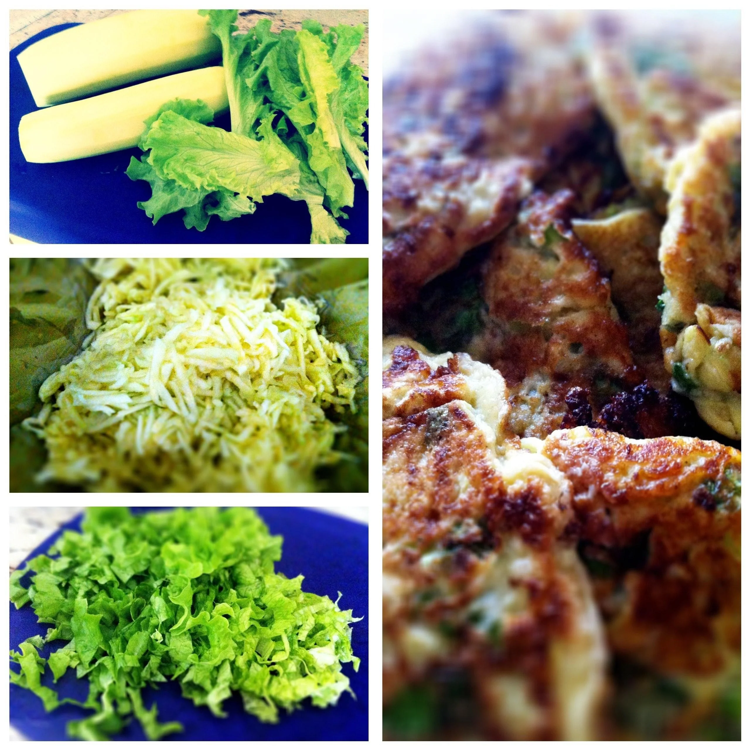 Оладьи из цукини с зеленым салатом, рукколой и базиликом